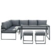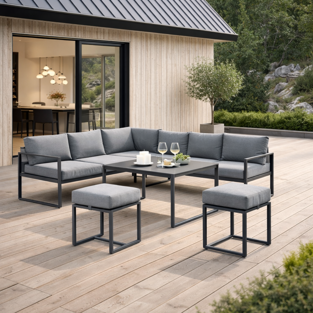 Aiamööbli komplekt Evora on loodud neile, kes hindavad mugavust, kvaliteeti ja kaasaegset disaini. Elegantne nurgadiivan, minimalistlik laud ja lisataburetid loovad tervikliku lounge-ala, mis sobib ideaalselt nii perega aja veetmiseks kui ka külaliste võõrustamiseks.