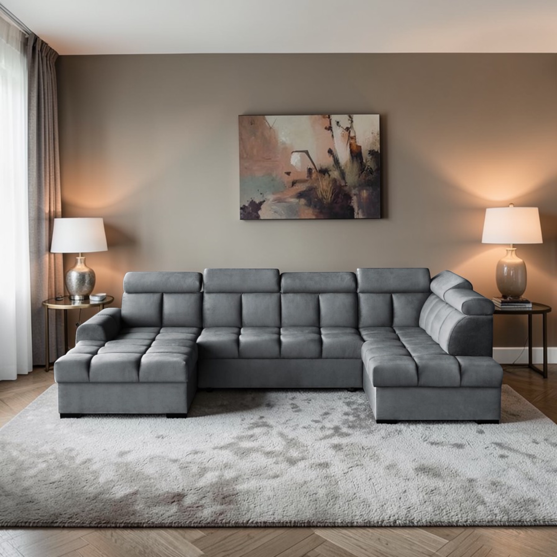 Gomes U on suur ja stiilne U-kujuline nurgadiivanvoodi, mis ühendab tänapäevase disaini, praktilise funktsionaalsuse ja maksimaalse mugavuse. See on ideaalne lahendus avaratesse elutubadesse, kus hinnatakse nii esteetikat kui ka kasutusmugavust.