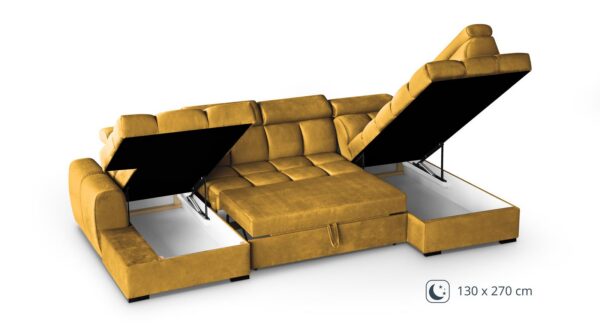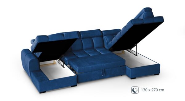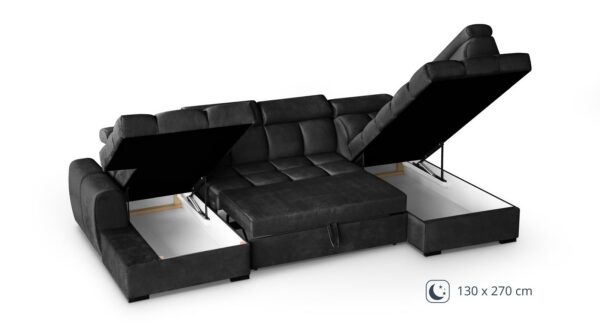 Kaks integreeritud panipaika võimaldavad hoiustada voodipesu, tekke ja patju, hoides elutoa alati korras ja organiseeritud.