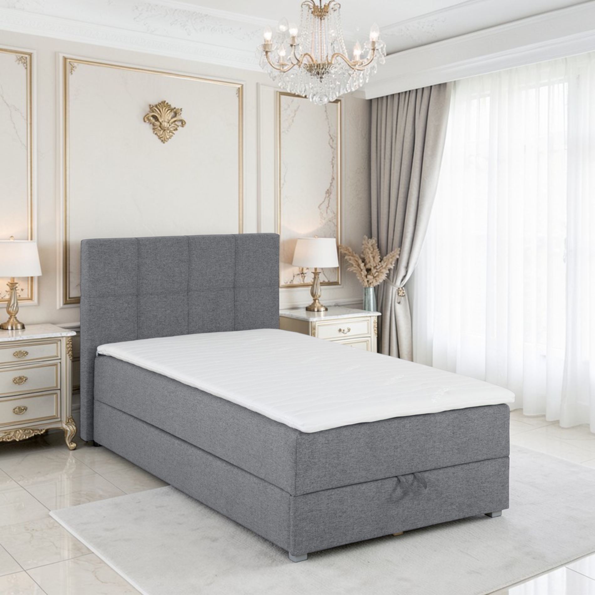 • Voodi on varustatud mahuka pesukastiga, mis pakub rohkelt hoiustamisruumi voodipesu ja muude esemete jaoks, aidates hoida magamistuba korrastatuna ja esteetilisena.